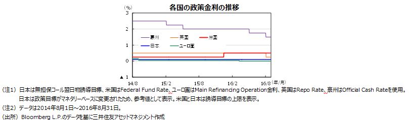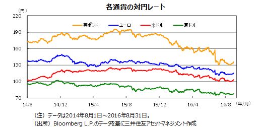 ユーロ圏では、足元の消費者物価(8月前年同月比+0.2%)がECBの目標(同+2.0%)を大きく下回っています。英国のEU離脱選択の影響からユーロ圏の経済成長率が鈍化すれば、物価は一段と上がりにくくなると見られ、ECBは9月の理事会で追加緩和に踏み切ると予想されます。
