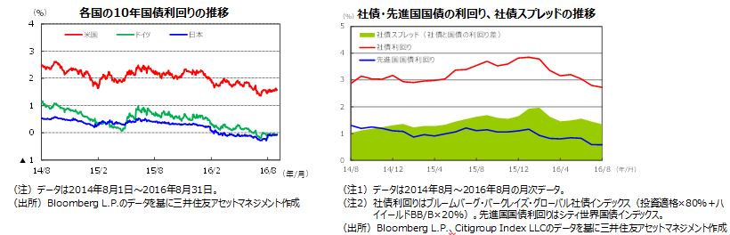 長期金利は、金融緩和のあった英国が低下しましたが、米国、ドイツ、日本が上昇しました。米国ジャクソンホール会議でのイエレンFRB議長の講演や米金融当局者の発言を受けて、早期の米利上げが意識され、米国債が下落しました。8月末の米国10年国債利回りは1.58%と、前月末比で0.13%上昇しました。日本では、9月の金融政策決定会合で公表される日銀の総括的な検証が警戒され、10年国債利回りが上昇しました。 世界的な低金利環境を反映して、社債に対する投資家の需要は継続しており、社債スプレッドはやや縮小しました。