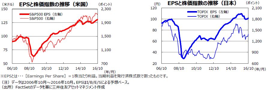 S&P500指数の1株当たり予想利益(EPS)は緩やかな上昇傾向にあります。7-9月期は前年同期比マイナスと見られていましたが、+3.2%と増益の見込みです(トムソンロイター11月1日発表ベース)。10-12月期は同+7.1%、17年1-3月期は同+14.1%、17年4-6月期は同+11.8%と回復が見込まれています。一方、日本の東証株価指数(TOPIX)の予想EPSは16年6月に当面の底をつけたもようです(16年6月99.57円)。7月以降改善傾向にあり、10月は101.67円と4カ月連続の上昇となりました。