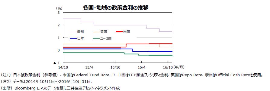 | 債券 | 米国では、12月にも利上げが行われる可能性がありますが、日欧の低金利環境下で投資家の米国債に対する需要が強いこともサポート要因となることから、米金利の上昇は限定的となり、利回りはレンジ圏で推移すると見込まれます。欧州では、ECBが金融緩和策を強化する見通しですが、買取ルールの見直しにより、テーパリング(金融緩和策の縮小)の観測もくすぶるため、長期金利は緩やかにレンジを切り上げる展開が見込まれます。日本では、日銀のイールドカーブ・コントロールにより、日本国債の利回りは低位での推移が見込まれます。米国など主要国の社債市場は、企業の底堅い業績などを背景に、社債スプレッドは引き続き安定的に推移する見通しです。 |