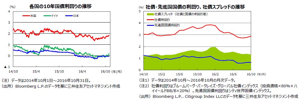米国では、12月にも利上げが行われる可能性がありますが、日欧の低金利環境下で投資家の米国債に対する需要が強いこともサポート要因となることから、米金利の上昇は限定的となり、利回りはレンジ圏で推移すると見込まれます。欧州では、ECBが金融緩和策を強化する見通しですが、買取ルールの見直しにより、テーパリング(金融緩和策の縮小)の観測もくすぶるため、長期金利は緩やかにレンジを切り上げる展開が見込まれます。日本では、日銀のイールドカーブ・コントロールにより、日本国債の利回りは低位での推移が見込まれます。米国など主要国の社債市場は、企業の底堅い業績などを背景に、社債スプレッドは引き続き安定的に推移する見通しです。