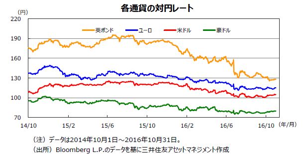 円相場は、対ドル、対ユーロで下落しました。欧米の長期金利が大幅に上昇したことで、日本との金利差が拡大し、低金利通貨の円が下落しました。円は、対ドルで一時105円台と、約3カ月ぶりの安値水準をつけましたが、月末に米大統領選のクリントン候補の私用メール問題が再燃したのをきっかけに、やや反発しました。円相場は、対ドルでは104円台後半で、対ユーロでは、115円台近辺で取引を終えました。一方、ユーロは、米欧の景況感の違いに加え、年内の米利上げとECBの追加緩和が意識され、対ドルで下落し、約8か月ぶりの安値水準となりました。また、英国のEU離脱交渉の行方や離脱後の英国経済の不透明感などから、英ポンドも下落しました。