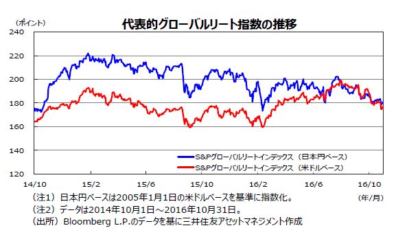 10月のリート市場は狭いレンジで推移し、下旬にかけて調整色を強めました。上旬は、米国の9月の製造業・非製造業ISM景況感指数が好調なことや、米連邦準備制度理事会(FRB)地区連銀総裁から早期利上げを促す発言が相次いだことなどから長期金利が上昇しました。長期金利の上昇が嫌気されリート市場は下落しました。下旬は、米国の年末利上げ観測の高まりや英国の7-9月期の実質GDP成長率が前期比で+0.5%となるなど好調さを示したことなどから、主要国の金融緩和期待が後退しました。世界的に金利が上昇したことで、リート市場は調整色を強めました。S&Pグローバルリートインデックスの変動率は米ドルベースで▲6.2%、日本円ベースで▲2.7%でした。