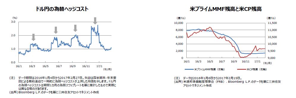 ドル円の為替ヘッジコストは2016年の年初から上昇傾向にありました。これは2016年10月14日から施行された米MMF改革の影響と思われます。この改革で機関投資家向けの「プライムMMF(主にCPやCDなどに投資)」の1口当たり基準価額(NAV)は、一律1米ドルの固定制から変動制に移行し、プライムMMFから変動NAV非適用の「ガバメントMMF(主に国債などに投資)」へ資金移動が起こりました。CP需要の減少で、米国外の金融機関はCP発行ではなく資金市場でドル調達を増やした結果、米金利が上昇し、ヘッジコスト上昇につながったと推測されます。