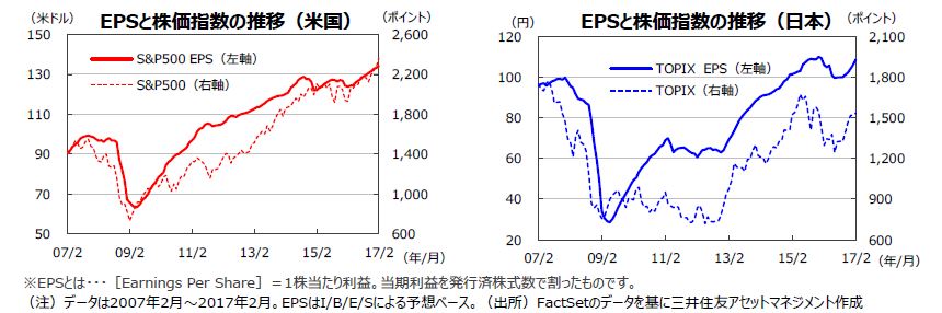 S&P500指数の1株当たり予想利益(EPS)は16年2月の123.94米ドルを底に回復傾向にあります。17年2月は134.21米ドルと7カ月連続で過去最高を更新しました。一方、東証株価指数(TOPIX)の予想EPSも16年6月の99.78円を底に堅調に推移しています。