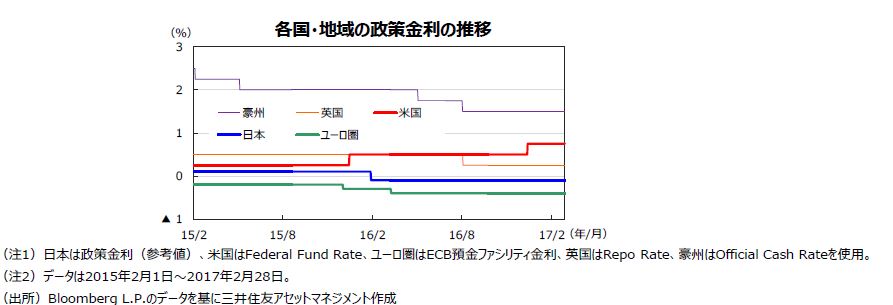 日本では、日銀が経済成長率の見通しを上方修正しましたが、17年度以降の物価については、前回(16年10月時点)の見通しを据え置いたことから、金融政策は当面現状維持を見込みます。