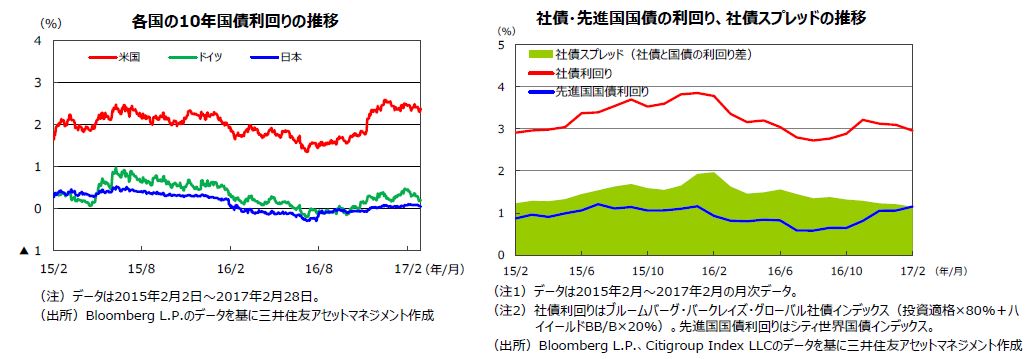 日米欧の長期金利は低下しました。FOMC議事録等を受けて早期の米利上げ観測が後退するなか、米新政権による政策運営の不確実性やフランスの大統領選を巡る不透明感の強まりなどを背景に投資家が運用リスクを避け、安全資産とされる債券を買う動きが優勢となりました。米国の10年国債利回りはレンジ内でもみあいとなりましたが、2.390%に低下して終了しました。欧州では政治リスクが注目され、ドイツ10年国債の利回りは0.208%と、大幅に低下しました。日本の10年国債利回りも0.050%に低下して引けました。社債については、投資家の利回りへの需要が継続していることから、社債スプレッドは縮小しました。