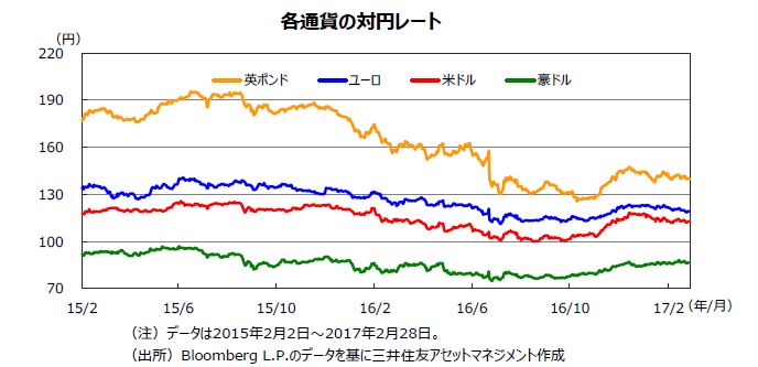 円相場は、対ドルでは月間でほぼ変わらずとなりました。米景気の好調ぶりを示す経済指標が続く反面、FRBによる3月の利上げは難しいとの見方が強まったことから米金利が低下し、日米の金利差縮小を見込んだ円買い・ドル売りが入ったため、一進一退の展開となりました。一方、欧州政治の先行きに不透明感がくすぶるなか、ユーロは対円、対ドルで下落しました。円は1ユーロ=119円台前半に上昇しました。また、円は対豪ドルで、86円台半ばに下落しました。資源価格の上昇などを手掛かりに、豪ドルが堅調な展開となったことが背景です。