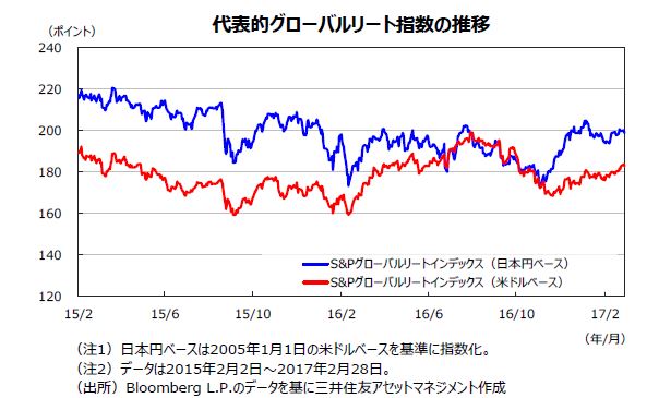 2月のグローバルリート市場は、トランプ大統領が「驚くべき税制」を近く発表するとしたことから、トランプ米新政権の景気浮揚策への期待が高まり、米国株式市場が過去最高値を更新したことや、早期の米利上げ観測が後退し、米長期金利上昇が低下したことなどを背景に、米国を中心に全体として堅調な展開となりました。ただし、欧州では、フランス大統領選挙などの政治リスクが懸念され、フランスなどで上値の重い展開となりました。S&Pグローバルリートインデックスの変動率は米ドルベースで+2.9%、日本円ベース+2.3 %でした。