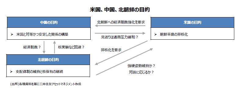 現在、朝鮮半島では、米国、中国、北朝鮮の思惑が交錯するなか、軍事的な緊張が高まっています。米国の目的は、朝鮮半島の非核化です。米国は中国に対し、北朝鮮への原油供給停止など経済制裁の強化を求め、その見返りとして通商圧力の緩和を考えていると推測されます。また中国の目的は、米国と対等かつ安定した関係を構築することです。そのため中国にとって北朝鮮に一定の影響力を持つことは、米国との交渉上、重要なカードとなります。ただ北朝鮮が崩壊してしまうと多くの難民が押し寄せる恐れもあり、中国はそのような事態の回避に努めると思われます。