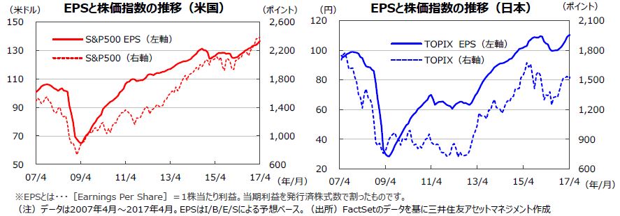 S&P500指数の17年4月の1株当たり予想利益(EPS)は136.67ドル(前年同月比+9.1%)と10カ月連続で過去最高を更新しました。一方、東証株価指数(TOPIX)の予想EPSも110.33円(前年同月比+6.1%)と、3カ月連続で前年同月比プラスとなりました。