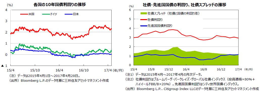 4月の債券市場は、地政学リスクや仏大統領選挙の不透明感が高まったことから、投資家のリスクオフ(回避)姿勢が強まり、買いが優勢となりました。日米欧の長期金利は4月中旬にかけて低下余地を探る展開となりましたが、仏大統領選挙の第1回投票の結果を受けて、マクロン候補が決選投票で勝利するとの見方が強まり、リスクオフ(回避)の動きはやや後退しました。月下旬には、各国の長期金利は上昇し、月間の低下幅を縮めました。月末では米国10年国債利回りは2.280%に低下しました。ドイツ10年国債利回りは0.317%と、小幅低下しました。日本の10年国債利回りは0.015%に低下しました。社債については、投資家の利回りへの需要が継続していることから、社債スプレッドが小幅縮小しました。
