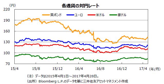 4月の円相場は、対ドルで横ばい、対ユーロで下落、対豪ドルでは上昇となりました。北朝鮮やシリアをめぐる地政学リスクが高まったことからリスクオフ(回避)の動きが強まり、4月中旬にかけ円買いが優勢になりました。円相場は1ドル=108円台まで上昇しましたが、仏大統領選挙第1回投票の結果を受けて、マクロン候補が決選投票で勝利するとの見方が強まると、投資家のリスクオフ(回避)姿勢は後退しました。ユーロが大きく買われる展開となるなか、月末にかけて円相場は対ドルで、1ドル=111円台半ばに下落しました。対ユーロでは、1ユーロ=121円台半ばで引けました。一方、対豪ドルでは、資源価格の下落などを手掛かりに豪ドルが軟調な展開となり、83円半ばに上昇しました。