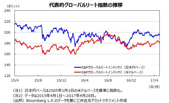 グローバルリート市場は、地政学リスクや欧州政治リスクの高まりから、欧米の長期金利が低下したため、4月中旬にかけ上昇しました。しかし、仏大統領選挙第1回投票の結果を受けて欧州政治リスクが後退したことや一時期よりも地政学リスクが和らいだことから、長期金利が上昇に転じたため、下旬に米国を中心に調整し、グローバルリート市場は、月間では小幅な上昇となりました。地域別にみると、米国はほぼ横ばい、政治リスクの後退した欧州や金利低下を好感したアジア・オセアニアは上昇、日本は下落となりました。S&Pグローバルリートインデックスの変動率は米ドルベースで0.4%、日本円ベースで0.5%でした。