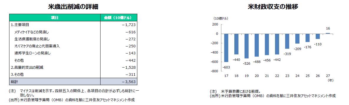 トランプ米政権が発表した予算教書によると、歳出は今後10年間で約3兆5,630億ドル削減されることになります。予算教書が前提とする実質GDP成長率は、規制緩和や税制改革などで生産性と労働参加率が上昇し、2021年には前年比+3.0%に達し、それ以降2027年まで3.0%成長が続くというものです。その結果、今後10年間で税収が2兆620億ドル増加し、財政収支は2027年に黒字化するとしています。しかしながら、大型減税は詳細が示されず、インフラ投資の予算も2,000億ドルのみとなっており、3.0%成長の継続は非現実的と思われます。