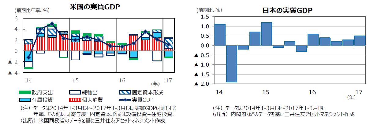 米国は、17年1-3月期の実質GDP成長率が前期比年率+1.2%にとどまりましたが、悪天候の影響などによる一時的なものと考えられます。