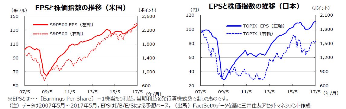 S&P500指数の17年5月の1株当たり予想利益(EPS)は137.95ドル(前年同月比+8.8%)と8カ月連続で過去最高を更新しました。一方、東証株価指数(TOPIX)の予想EPSも110.42円(前年同月比+9.5%)と、4カ月連続で前年同月比プラスとなりました。