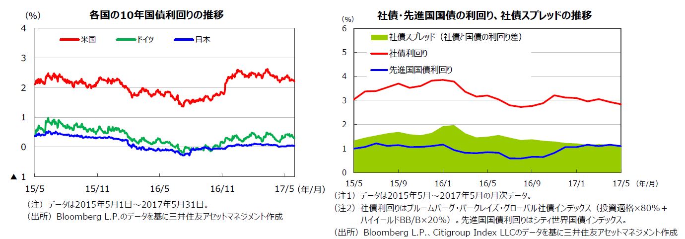 5月末の債券利回りは前月末に比べほぼ横這いとなりました。米国では、5月2日、3日に開催されたFOMCの声明文を受け、早期利上げ観測が浮上したことなどから、上旬の債券利回りは上昇しました。しかし、下旬になると、「ロシアゲート」疑惑(トランプ政権によるロシアへの機密漏えい疑惑)が台頭し、同政権が唱える拡張的な財政政策の先行きに不透明感が強まったため、利回りは低下しました。欧州では、イギリスでの自爆テロ事件を受けてリスクオフ(回避)の動きが強まりました。月末の米国10年国債利回りは2.20%、ドイツ10年国債利回りは0.30%、日本の10年国債利回りは0.04%でした。社債については、投資家の利回りへの需要が継続していることから、社債スプレッドが小幅縮小しました。