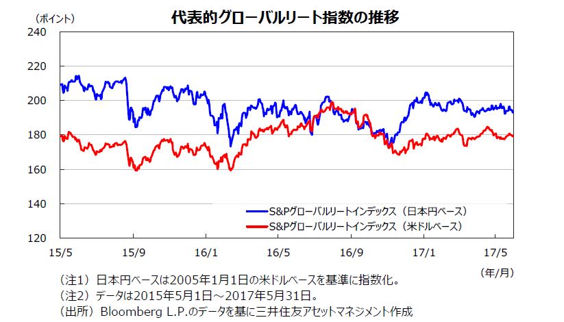 グローバルリート市場は、月初に開催された米FOMCの声明文を受けて、FRBによる早期の利上げ観測が台頭したことから、中旬まで軟調な動きとなりました。その後、ロシアゲート問題の浮上により米政治・経済の先行きに不透明感が強まったため長期金利が低下し、リート市場も米国を中心に上昇に転じました。月間では、グローバルリート市場は、小幅な上昇となりました。