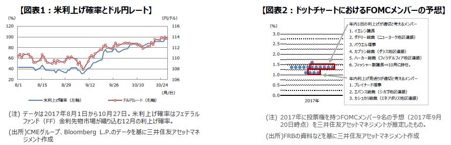 ドットチャートとは、米連邦公開市場委員会(FOMC)メンバーが適切と考える政策金利水準の分布図です。市場が注目するのは予想分布の中央値であり、ここから政策金利の変更回数を読み取ります。9月19日、20日のFOMCで公表されたドットチャートをみると、2017年末の中央値は1.375%、2018年末は2.125%となっています。これは、2017年はあと1回の利上げ、2018年は年3回の利上げを示唆しています。9月のFOMC後、年内利上げの織り込みが進み、ドル円はドル高・円安方向に振れました(図表1)。