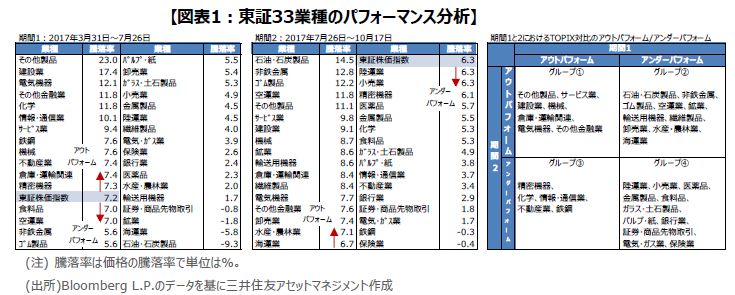 グループ①の「建設業」は、都心の再開発や東京五輪関連工事の本格化が追い風となっており、「機械」は、中国からの工作機械の受注回復などが好感されています。グループ②には、「非鉄金属」、「ゴム製品」など4-6月期の好決算を機に、パフォーマンスが改善した傾向がみられます。グループ③の「鉄鋼」や「化学」の4-6月期決算は、総じて良好な内容でしたが、前年度から堅調な動きが続いていたため、いったん材料出尽くしの反応と思われます。グループ④の「銀行」など金融は、依然として続くマイナス金利環境が、「電気・ガス業」や「食料品」は、市場の期待に届かなかった一部企業の決算が、それぞれパフォーマンスに影響したと考えます。