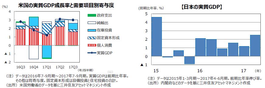 S&P500指数採用企業の17年予想EPSは、10月31日時点で前年比+11.4%と二桁の増益が予想されています。続く18年も17年と同じ、同+11.4%の増益が予想されています(トムソン・ロイターズI/B/E/S)。一方、日本の17年度予想経常増益率は、前年度比+14.0%(前月同+13.5%)、18年度が同+9.0%(前月同+8.9%)とそれぞれ上方修正となっています(東証1部除く金融、QUICKコンセンサスベース、17年10月31日時点)。日米ともに企業業績に対する期待が強く、下振れリスクは限定的なものにとどまりそうです。11月は、米国は税制改革案の審議の行方、日本は15日に発表される7-9月期のGDP統計などが注目されそうです。