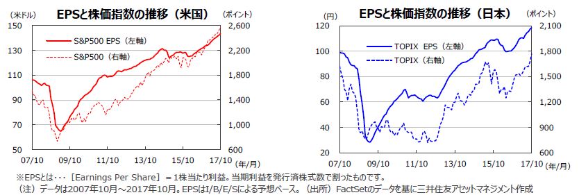 S&P500指数の17年10月の1株当たり予想利益(EPS)は143.50米ドル(前年同月比+9.0%)と、13カ月連続で過去最高を更新しました。東証株価指数(TOPIX)の予想EPSは118.38円(同+17.0%)と、5カ月連続で二桁の伸びとなりました。米国株式市場は、ハリケーンの影響で雇用統計が悪化したことで上値の重い局面もありましたが、総じて堅調な経済指標や相次ぐ個別企業の好決算を背景に、上昇基調を強めました。また、米上下院が2018年度連邦予算の決議案を可決したことで、減税の実現に対して期待が高まったことも相場を支えました。一方、日本株式市場は、米国株式市場に連動して上昇する展開となりました。米国で米長期金利が上昇し、円安・ドル高が進んだことで、企業収益の上振れ期待が高まりました。また、衆院選挙後の経済対策への期待等も強く、海外投資家の積極的な投資などから上昇基調を強めました。