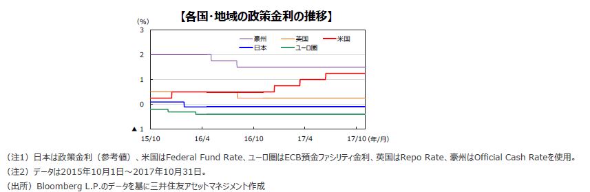 FRBは、10月31日~11月1日開催のFOMCで、政策金利(FFレート)の誘導レンジを1.00%~1.25%で据え置くことを決定しました。10月からECBは、10月26日の理事会で政策金利、預金ファシリティ金利をそれぞれ0.00%、▲0.40%に据え置きました。量的緩和政策については、18年1月以降の月間購入額を従来の600億ユーロから300億ユーロに半減し、18年9月まで続けることを決定しました。日本銀行は10月30~31日に開催した金融政策決定会合で、金融政策の現状維持を決定しました。短期の政策金利を▲0.1%、長期金利である10年物国債利回りをゼロ%程度に操作する金融調節を維持しました。長期国債を買い増すペースも年約80兆円を目処とすることを据え置きました。