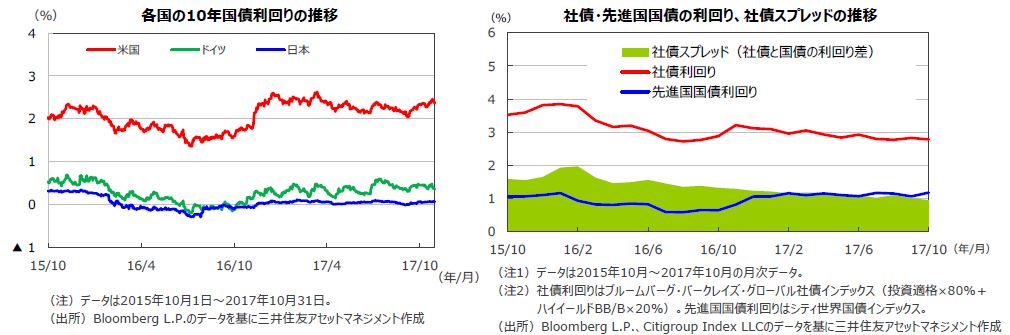 10月の米国10年国債利回りは小幅な上昇(債券価格は下落)となりました。堅調な内容の景気・物価指標が発表されたことに加え、FRB次期議長候補としてタカ派と目されるウォーシュ元FRB理事などの名前が浮上したこと、18年度予算決議案の議会通過で大型減税案前進との思惑が強まったことなどによるものです。一方、ドイツ10年国債利回りは低下しました。ドイツ議会選挙後の連立政権やスペインのカタルーニャ州独立問題といった、政治的な不透明感が金利低下要因となりました。日本の10年国債利回りはほぼ横ばいでした。社債については、高利回りと安定性の双方を追求する投資家からの需要が引き続き旺盛で、国債とのスプレッドが縮小しました。