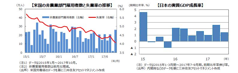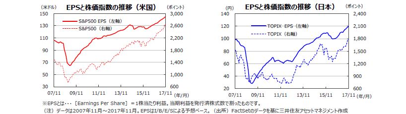 S&P500指数の17年11月の1株当たり予想利益(EPS)は144.77米ドル(前年同月比+9.6%)と、14カ月連続で過去最高を更新しました。東証株価指数(TOPIX)の予想EPSは120.16円(同+17.4%)と、6カ月連続で二桁の伸びとなりました。