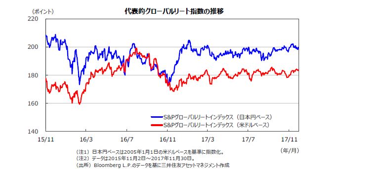 グローバルリート市場は、法人税減税を盛り込んだ米国の税制改革法成立への期待から株価が値上がりしたことを受けて、上昇しました。ただし、円が主要通貨に対して下落したことから、日本円ベースでは小幅な上昇となりました。