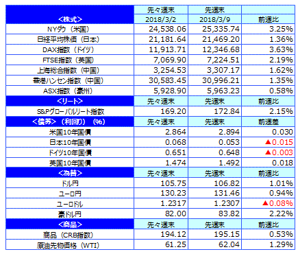 主要国の株式市場は上昇しました。米国株式市場は、米朝対話が実現する見込みとなったことや、週末発表の2月雇用統計で、2月の株価急落のきっかけとなった賃金の伸びが市場予想を下回り、安心感が広がり上昇しました。NYダウは週間では3.25%上昇しました。日経平均株価は週初は、105円台の円高等を嫌気して下落して始まりました。その後は北朝鮮リスクの後退や、円高の一服・米国株高を受けて株価は戻り歩調となり、週末には日経平均株価は一時500円を上回る上昇となりましたが、森友学園を巡る国会の混乱などから株価は伸び悩みました。日経平均株価は週間では1.36%上昇しました。欧州株式市場では、独DAX指数は世界的な株高や大連立政権樹立が最終決定されたことなどを好感して、週間では3.63%上昇しました。英国FTSE指数は上昇しました。中国株式市場は、上海総合指数、香港ハンセン指数ともに上昇しました。