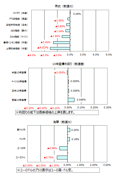 米国の10年国債利回りは、日銀が金融緩和政策を修正するとの観測報道を受けて上昇する場面もありましたが、貿易摩擦激化への警戒感などから低下し、週間ではほぼ横ばいとなりました。英国の10年国債利回りは上昇しました。ドイツと日本の10年国債利回りは、ほぼ横ばいとなりました。