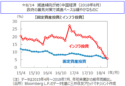 主要国の株式市場は米国や豪州市場を除き下落しました。米国株式市場は、週前半はトルコ情勢への警戒感や米中貿易摩擦の激化懸念で上値の重い展開となりました。週後半は米中首脳会談が11月にも開催される可能性があるとの報道を受けて米中貿易協議の再開期待が高まり上昇しました。NYダウは週間では1.41%上昇しました。日本株式市場では、日経平均株価は、週初はトルコリラの急落を受けた新興国通貨安を嫌気して、22,000円を割り込みました。翌日はリラ安が一服すると急反発しました。その後再び下落しましたが、米中貿易協議の再開期待が高まり反発し、週間では小幅な下落となりました。欧州株式市場では、トルコ情勢や中国の7月の主要経済指標が下ぶれたことなどを嫌気して、ドイツDAX指数は1.72%、英FTSE指数は1.41%下落しました。中国株式市場では、主要経済指標の下ぶれや人民元安への警戒感が高まり、上海総合指数、香港ハンセン指数はともに大幅に下落しました。