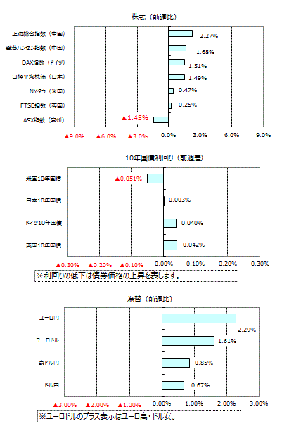 米国の10年国債利回りは、パウエルFRB議長が講演で緩やかな利上げスタンスを示したことから週間では利回りが0.051%低下しました。英国とドイツの10年国債利回りは上昇、日本の10年国債利回りは横ばいでした。