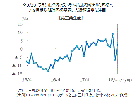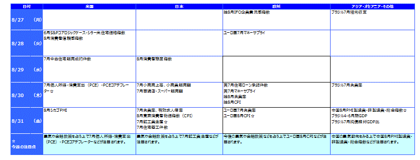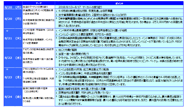 主要国の株式市場は豪州市場を除き上昇しました。米国株式市場は、米中双方が第2弾の追加関税を発動したことなど不透明感はありましたが、週末はパウエル米連邦準備制度理事会(FRB)議長の講演で緩やかな利上げスタンスが維持されたことで安心感が広がり上昇しました。NYダウは週間では0.47%上昇しました。S&P500とNASDAQ総合指数は高値を更新しました。日本株式市場では、新興国に対する過度な警戒が和らいだことや米国での9月の利上げが意識され、円安となったことなどを好感して上昇しました。週間では日経平均株価は1.49%上昇しました。欧州株式市場では、トルコや新興国に対する過度な警戒が和らいだことなどを受けて、ドイツDAX指数は1.51%、英FTSE指数は0.25%上昇しました。中国株式市場では、政府系機関による買い支え観測が支援材料となり、上海総合指数、香港ハンセン指数はともに上昇しました。米中双方が第2弾の追加関税を発動しましたが、影響は限定的となりました。豪州は首相交代に伴う政治的不透明感が嫌気され下落しました。
