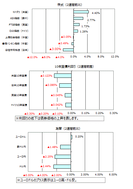 米国の10年国債利回りは、米中貿易摩擦に伴う世界景気の減速懸念、米政府機関閉鎖の長期化懸念などを受けて、同期間に0.123%低下しました。米国の10年国債利回り低下を受けて、ドイツ、英国、日本の10年国債利回りも低下しました。