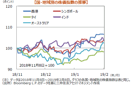 主要国の株式市場はまちまちの動きとなりました。米国株式市場は、週前半は好調な企業決算発表が続き堅調に推移したものの、欧州委員会がユーロ圏の成長率見通しを引き下げたことや、米中通商摩擦への懸念が高まったことを受けて株価は伸び悩みました。NYダウは週間で0.17%の小幅な上昇となりました。日本株式市場は、ピークを迎えた決算発表が全体的にさえないものとなっている他、米中通商摩擦への懸念が高まったことなどを受けて下落しました。日経平均株価は2.19%下落しました。欧州株式市場では、ドイツDAX指数は景気の減速懸念などから2.45%下落しました。一方、英国FTSE指数は英ポンド安基調を好感して0.73%上昇しました。中国株式市場は、香港ハンセン指数はほぼ横ばいとなりました。
