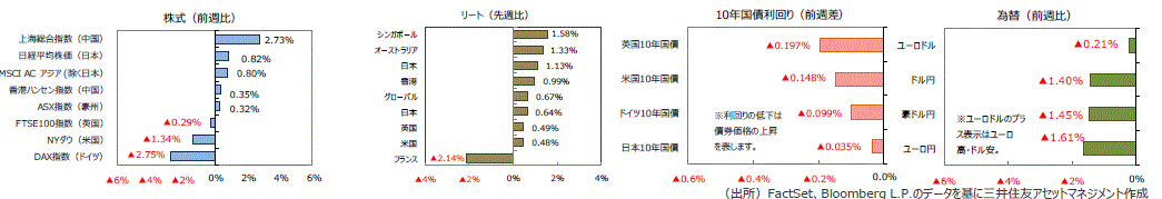 米国の10年国債利回りは、FOMCで年内の利上げ休止の見通しが示され、資産縮小の9月終了が表明されたことなどから週間では0.148%低下しました。ドイツ、英国、日本の10年国債利回も低下しました。