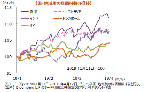 主要国の株式市場は比較的小幅な動きとなりました。米国株式市場は国際通貨基金(IMF)による世界経済見通し引き下げや米欧の通商摩擦が懸念された一方、米連邦公開市場委員会(FOMC)議事録でハト派姿勢が確認されたことや、金融機関の好決算を受けてほぼ横ばいとなりました。日本株式市場は、米市場同様の懸念材料はありましたが、一部値嵩株の上昇が牽引して日経平均株価は週間では0.29%と小幅に上昇しました。欧州株式市場は、IMFによる世界経済見通し引き下げなどが嫌気され、ドイツDAX指数、英FTSE100指数は小幅に下落しました。中国株式市場も同様の理由により、上海総合指数は下落、香港ハンセン指数は小幅に下落しました。