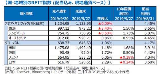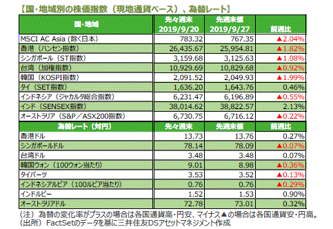 米国株式市場では、民主党がトランプ大統領に対する弾劾手続きを求めたことや、トランプ大統領が米国による中国への投資の制限を検討していると報じられたことなどを嫌気して、NYダウは週間では0.43%下落しました。日本株式市場は、トランプ米大統領が米中交渉の早期合意に前向きの見方を示したことで、TOPIX は一時年初来高値を更新する局面もありました。ただ27日の9月末の配当権利落ちの影響が大きく、週間では日経平均株価は0.91%下落しました。配当落ちの影響を除くと日経平均株価はほぼ横ばいでした。欧州株式市場では、ドイツの弱い経済指標などが嫌気され、ドイツDAX指数は0.70%下落、一方、イングランド銀行(英中央銀行)の利下げ示唆を受けてポンドが下落したことなどが好感され、FTSE100指数は1.11%上昇しました。中国株式市場では、米中協議に対する警戒などから上海総合指数は2.47%、香港ハンセン指数は1.82%下落しました。