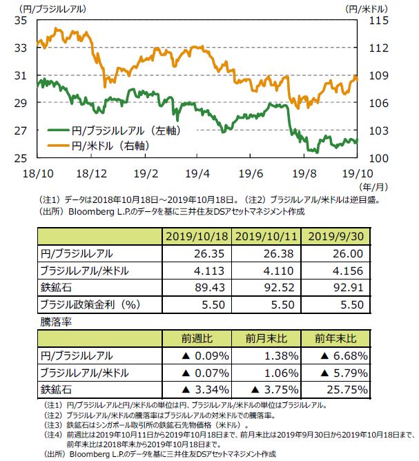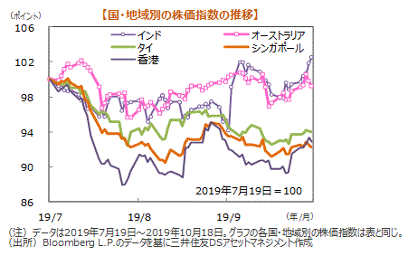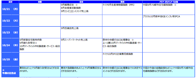 米国株式市場は、NYダウは好調な7-9月期決算発表や英国の合意なき欧州連合(EU)離脱の回避見通しを背景に、17日までおおむね堅調に推移しましたが、週末はダウ構成銘柄の航空機と医療大手の大幅な下落により、NYダウは下落しました。週間ではNYダウは0.17%下落しました。日本株式市場は、前週の米中閣僚級協議で両国が歩み寄り、10月15日に予定されていた米国による対中追加関税の引き上げが見送られたことや米企業の好業績を好感して大幅に上昇し、16日には年初来高値を更新しました。週間では日経平均株価は3.18%上昇しました。欧州株式市場では、英国の合意なきEU離脱の回避期待などからドイツ株は上昇したものの、英国株はポンド高が嫌気され下落しました。ドイツDAX指数は0.97%上昇、FTSE100指数は1.33%下落しました。中国株式市場では、上海総合指数は1.19%下落した一方、香港ハンセン指数は1.56%上昇しました。