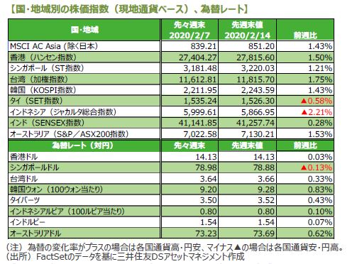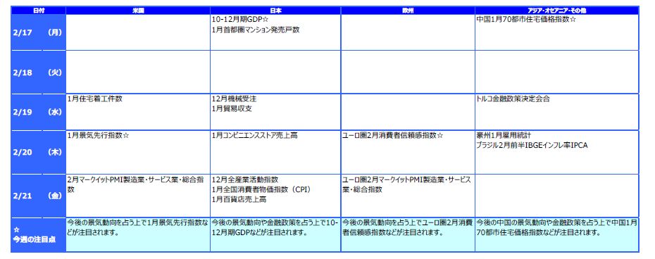 米国株式市場は、中国湖北省の新型肺炎感染者数の基準変更はありましたが、増加ペースが鈍化方向にあることで収束期待が継続したことや、好調な企業決算などを好感し、主要3指数がそろって史上最高値の更新しました。週間でNYダウは1.02%上昇しました。一方、日本株式市場は、米国株高などを受けて値を戻していたものの、中国で新型肺炎の感染者数が拡大したことを嫌気して反落しました。日経平均株価は0.59%下落しました。欧州市場ではポンド高を受けて英FTSE100指数が0.77%安と下落した一方、独DAX指数が1.70%高と続伸し、史上最高値を更新しました。中国株式市場では、中国の景気刺激策への期待などから香港ハンセン指数が1.50%上昇しました。中国本土市場の上海総合指数も、政府による景気対策への期待などを背景に急落後の買い戻しの動きが続き、1.43%上昇しました。