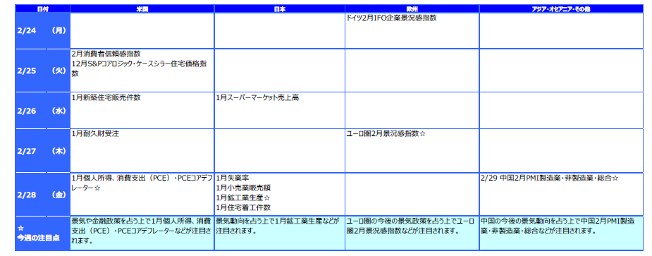 米国株式市場は、週前半は新型肺炎の感染者数の増加ペースが鈍化したとの見方などを受けてもみ合いとなりました。その後は新型肺炎の世界的な広がりによる世界経済の減速懸念や米経済指標の悪化などが嫌気され下落しました。週間でNYダウは1.38%下落しました。日本株式市場は、国内での新型肺炎の感染者数が増加したことや10-12月期GDP速報値が弱い結果となったことなどを嫌気して、日経平均株価は1.27%下落しました。欧州市場では、独DAX指数は新型肺炎の感染者数の拡大による景気悪化懸念が強まり1.20%下落しました。英FTSE100指数はポンド安が好感され、小幅安にとどまりました。中国株式市場では、上海総合指数は新型肺炎の感染者数の増加ペースが鈍化したとの見方や中国政府の積極的な景気支援策への期待などから4.21%上昇しました。香港ハンセン指数は新型肺炎拡大による世界経済の減速懸念などから1.82%下落しました。