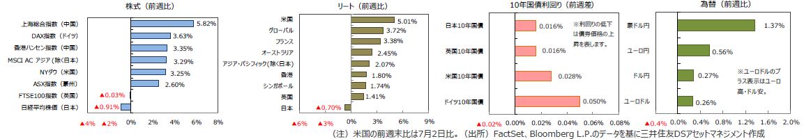 主要株式市場はおおむね堅調に推移しました。米国や新興国で新型コロナウイルスの感染拡大が続きましたが、主要国の経済指標が景気回復を示したこと等が好感されました。米国株式市場は、南部を中心に新型コロナの感染が拡大しているものの、ワクチン開発のニュースや良好な雇用統計、半導体企業の好業績等が好感されました。NYダウは週間では3.25%上昇しました。日本株式市場は、国内での新型コロナの感染者数の増加を受けて経済等への懸念が高まり、日経平均株価は週間では0.91%下落しました。欧州株式市場は、米国市場の上昇に連れて概ね上昇しました。DAX指数は3.63%上昇。FTSE100はほぼ横ばいの▲0.03%でした。中国株式市場は、企業景況感指数が大きく改善した他、人民銀行が再貸出し金利の引き下げを行ったことなどを好感して上昇しました。香港国家安全法が施行され、7月1日には多数の逮捕者が出ましたが、相場への影響は限定的でした。上海総合指数は5.82%上昇、香港ハンセン指数は3.35%上昇しました。