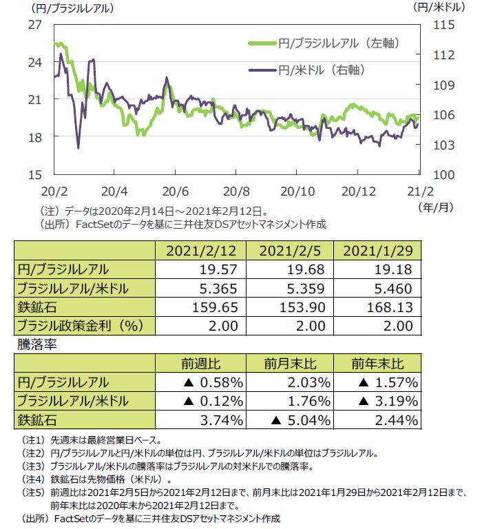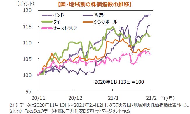 主要株式市場は米国での追加経済対策期待などを背景に概ね上昇しました。米国株式市場は決算発表が総じて良好な結果となったことや追加経済対策への期待に加えて、パウエル連邦準備理事会(FRB)議長が緩和的金融政策の長期化を示唆したことなどを好感して主要3指数がそろって最高値を更新して終了しました。NYダウは週間では1.00%上昇しました。日本株式市場は、企業決算に良好なものが多く、結果を好感して上昇する銘柄が相次いだことや、米国株の堅調も追い風になり、日経平均株価は29,000円を上回って終了しました。週間では日経平均株価は2.57%上昇しました。欧州株式市場は、FTSE100指数は商品市況の上昇を背景に資源株が上昇したことなどから1.55%上昇しました。DAX指数はほぼ横ばいとなりました。中国株式市場は、米国での追加経済対策期待や1月の中国の金融統計で、1月末時点の人民元建て融資残高が大幅に増加したことなどを受け、上海総合指数は4.54%、香港ハンセン指数は3.02%上昇しました。