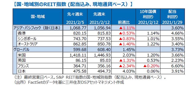 グローバル・リートは、主要株式市場が概ね上昇したことなどを好感して1.45%上昇しました。