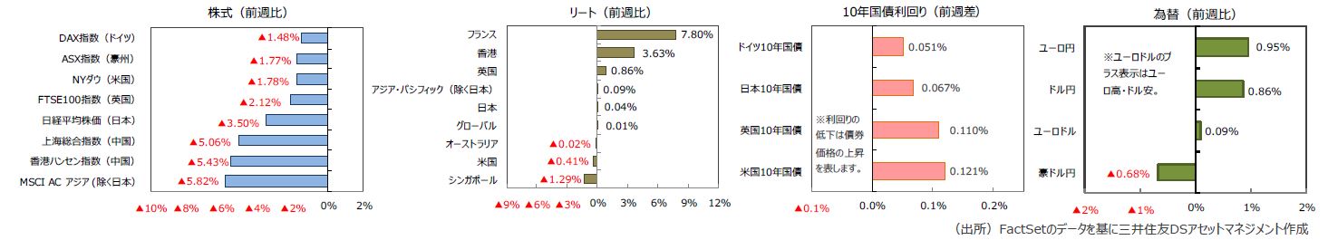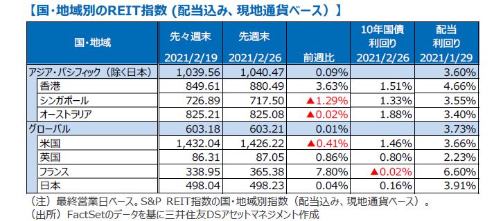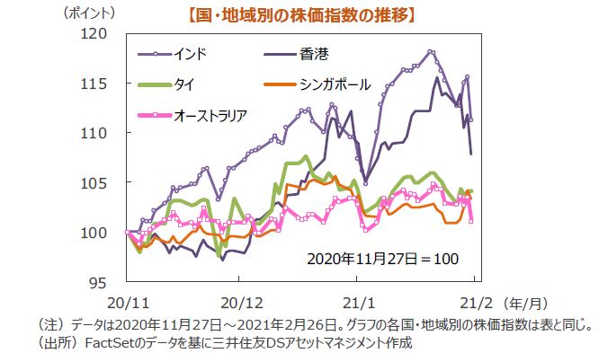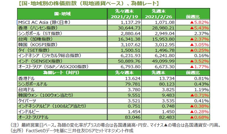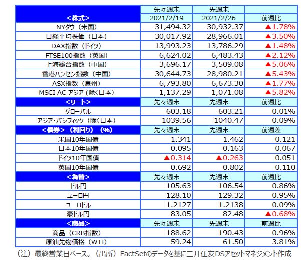 主要株式市場は米国の長期金利上昇などを嫌気して下落しました。米国株式市場は1.9兆ドルの追加景気対策法案の成立期待やワクチン接種進展による景気回復期待に加え、パウエル米連邦準備制度理事会(FRB)議長が緩和的金融政策の長期継続を示唆したことで堅調に推移しましたが、インフレや国債増発などが懸念され、長期金利の急上昇を受けて下落しました。NYダウは週間では1.78%下落しました。日本株式市場は、米国市場でグロース株が大きく売られたことや米10年債利回りが1.6%台をつけるなど金利上昇が加速したことなどから下落しました。26日には日経平均株価は1,202.26円と大幅な下落となり、週間では日経平均株価は3.50%下落しました。欧州株式市場は、米国における追加経済対策を背景とした物価や金利上昇に向けた懸念の高まりなどを嫌気してDAX指数は1.48%、FTSE100指数は2.12%下落しました。中国株式市場は、米長期金利の上昇や香港での株取引の印紙税引き上げ案を受け、上海総合指数は5.06%、香港ハンセン指数は5.43%下落しました。