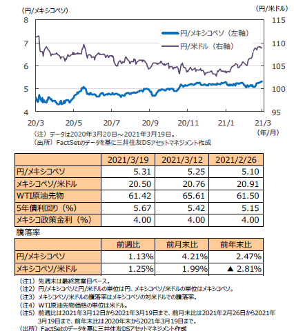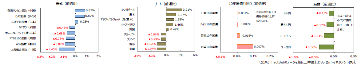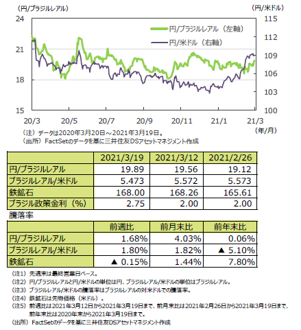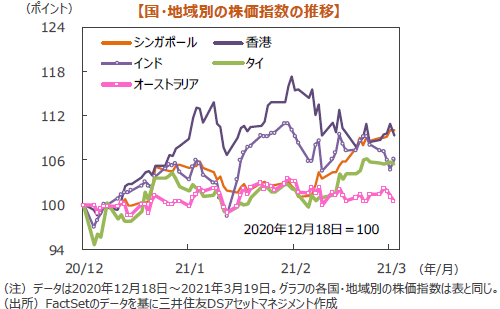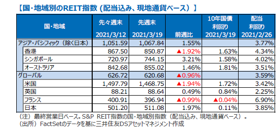 主要株式市場はまちまちとなりました。米国株式市場は、追加景気対策やコロナワクチン接種の進展などから景気の早期回復期待は強いものの、長期金利の上昇や米連邦準備制度理事会(FRB)が大手銀の資本規制の緩和措置終了を発表したことなどが嫌気されました。週間ではNYダウは0.46%下落しました。日本株式市場は、米国での追加景気対策などによる景気の早期回復期待を背景に堅調に推移しました。ただ週末は日銀の金融政策決定会合でのETF買い入れをTOPIX連動型のみにするとの発表を受け日経平均株価は大幅に下落し、週間では0.25%の上昇にとどまりました。欧州株式市場は、独DAX指数は米追加経済対策による景気回復期待などを背景に0.82%上昇しました。英FTSE100指数は原油安などを受けて0.78%下落しました。中国株式市場は、米中外交トップ会談での非難の応酬を受けて投資家心理が悪化し、上海総合指数が1.40%下落しました。香港ハンセン指数は米連邦公開市場委員会(FOMC)で金融緩和の長期化姿勢を示したことなどを好感して0.87%上昇しました。