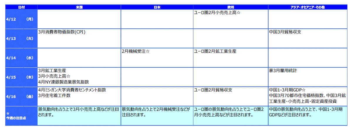主要株式市場はまちまちとなりました。米国株式市場は、前週2日に発表された3月雇用統計や、週明けに発表された3月ISM